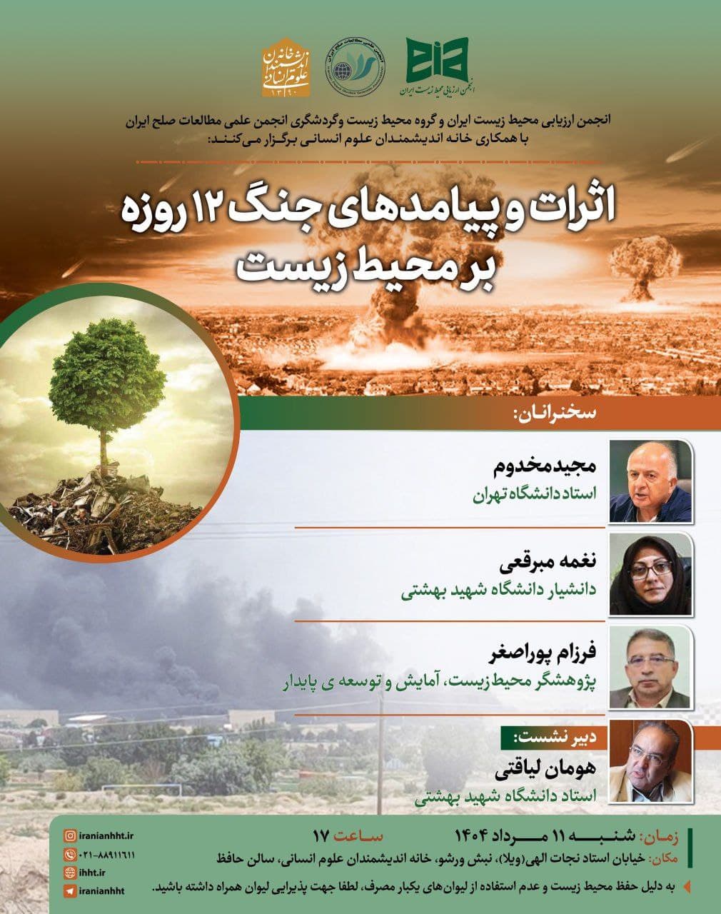 نشست "اثرات و پیامدهای جنگ 12 روزه بر محیط زیست" روز شنبه 11 مرداد در سالن حافظ خانه اندیشمندان علوم انسانی برگزار می شود.