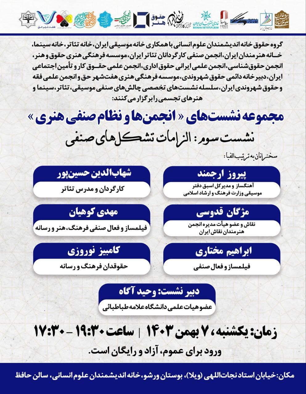 به گزارش روابط عمومی خانه اندیشمندان علوم انسانی، نشست "الزامات تشکلهای صنفی" به همت گروه حقوق خانه اندیشمندان علوم انسانی و با همکاری خانه موسیقی ایران، خانه تئاتر، خانه سینما، خانه هنرمندان ایران، انجمن صنفی کارگردانان تئاتر ایران، موسسه فرهنگی هنری حقوق وهنر، انجمن حقوق شناسی، انجمن علمی ایرانی حقوق اداری، انجمن علمی حقوق کار و تامین اجتماعی ایران، دبیرخانه دائمی حقوق شهروندی، موسسه فرهنگی هنری هفت شهر حق و انجمن علمی فقه و حقوق شهروندی، روز یکشنبه 7 بهمن 1403 ساعت 17:30 در سالن حافظ خانه اندیشمندان علوم انسانی برگزار می شود.