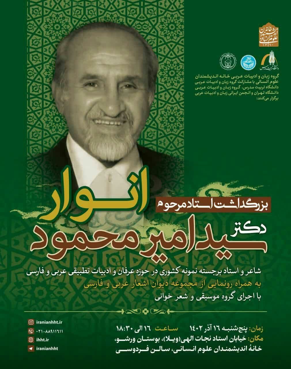 به گزارش روابط عمومی خانه اندیشمندان علوم انسانی، بزرگداشت "دکتر سید امیرمحمود انوار" به همت گروه زبان و ادبیات عربی خانه اندیشمندان علوم انسانی و با مشارکت گروه زبان و ادبیات عربی دانشگاه تربیت مدرس، گروه زبان و ادبیات عربی دانشگاه تهران و انجمن ایرانی زبان و ادبیات عربی، روز پنج شنبه ۱۶ آذر ۱۴۰۲ ساعت ۱۶ در سالن فردوسی خانه اندیشمندان علوم انسانی برگزار می شود.