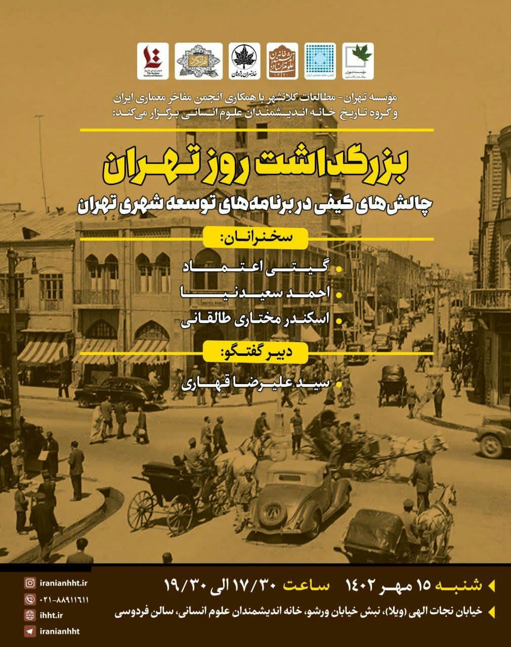 به گزارش روابط عمومی خانه اندیشمندان علوم انسانی، بزرگداشت "روز تهران" به همت موسسه تهران و با همکاری انجمن مفاخر معماری ایران و گروه تاریخ خانه اندیشمندان علوم انسانی، روز شنبه ۱۵ مهر ۱۴۰۲ ساعت ۱۷:۳۰ در سالن فردوسی خانه اندیشمندان علوم انسانی برگزار می شود.