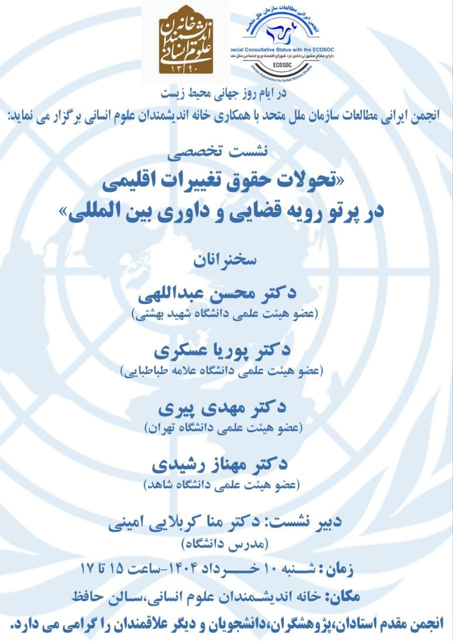به گزارش روابط عمومی خانه اندیشمندان علوم انسانی، نشست "تحولات حقوق تغییرات اقلیمی در پرتو رویه قضایی و داوری بین المللی" به همت انجمن ایرانی مطالعات سازمان ملل متحد و با همکاری خانه اندیشمندان علوم انسانی، روز شنبه 10 خرداد 1404 ساعت 15 در سالن حافظ خانه اندیشمندان علوم انسانی برگزار می شود.