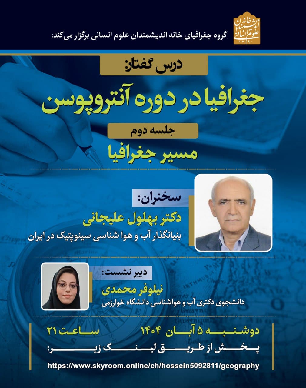 به گزارش روابط عمومی خانه اندیشمندان علوم انسانی، جلسه دوم درس گفتار "جغرافیا در دوره آنتروپوسن" به همت گروه جغرافیای خانه اندیشمندان علوم انسانی، روز دوشنبه 5 آبان 1404 ساعت 21 در بستر اسکای روم برگزار می شود.