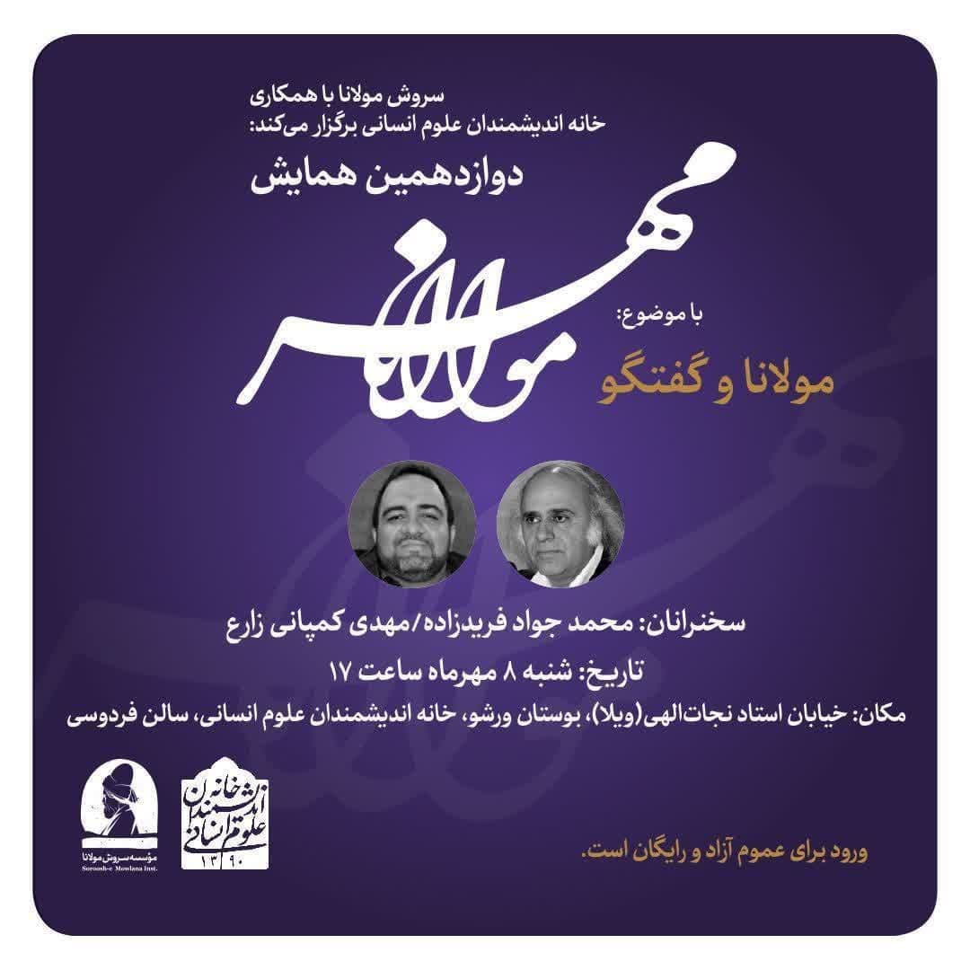 به گزارش روابط عمومی خانه اندیشمندان علوم انسانی، دوازدهمین همایش مهر مولانا با موضوع مولانا و گفتگو، به همت موسسه سروش مولانا و با همکاری خانه اندیشمندان علوم انسانی، روز شنبه ۸ مهر ۱۴۰۲ ساعت ۱۷ در سالن فردوسی خانه اندیشمندان علوم انسانی برگزار می شود.