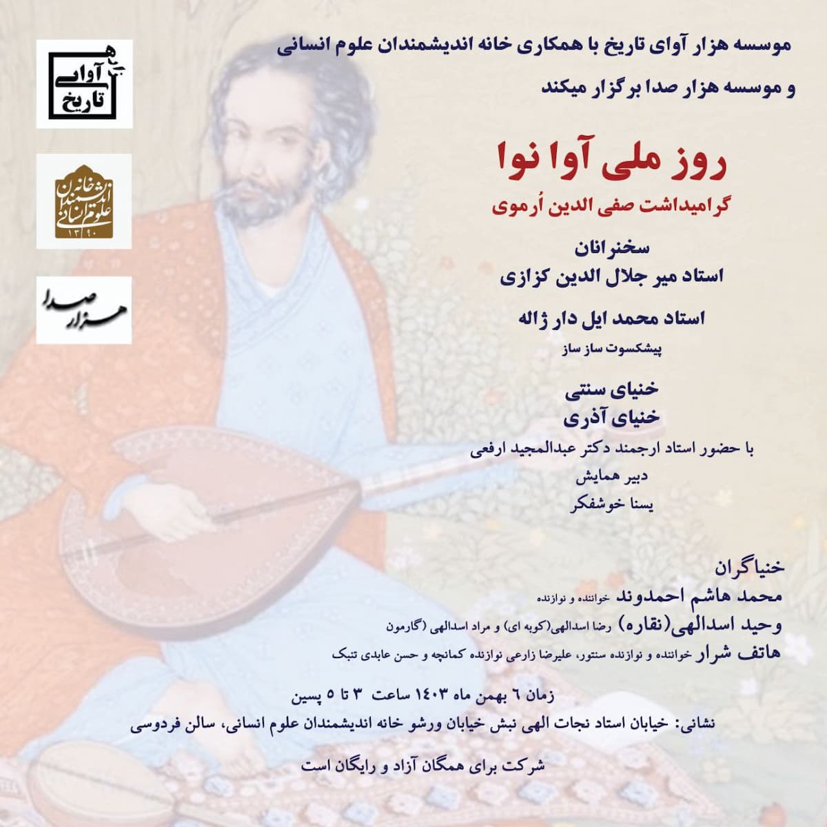 به گزارش روابط عمومی خانه اندیشمندان علوم انسانی، نشست "روز ملی آوا نوا؛ گرامیداشت صفی الدین ارموی" به همت موسسه هزار آوای تاریخ و با همکاری خانه اندیشمندان علوم انسانی و موسسه هزار صدا، روز شنبه 6 بهمن 1403 ساعت 15 در سالن فردوسی خانه اندیشمندان علوم انسانی برگزار می شود.