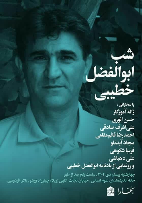 شب ابوالفضل خطیبی روز چهارشنبه ۲۰ دی در سالن فردوسی خانه اندیشمندان علوم انسانی برگزار می شود.