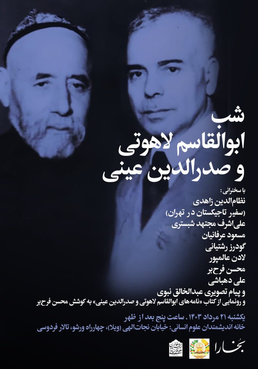 شب ابوالقاسم لاهوتی و صدرالدین عینی، روز یکشنبه 21 مرداد در سالن فردوسی خانه اندیشمندان علوم انسانی برگزار می شود.