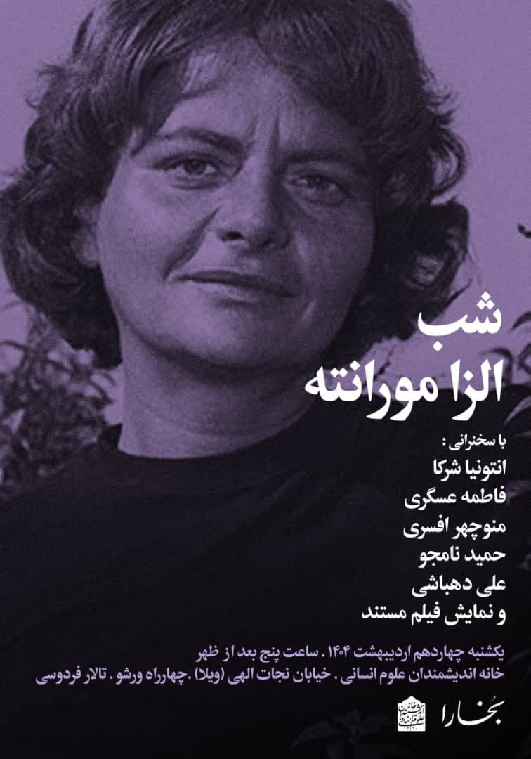 به گزارش روابط عمومی خانه اندیشمندان علوم انسانی، شب الزا مورانته، به همت مجله بخارا و با همکاری خانه اندیشمندان علوم انسانی، روز یکشنبه 14 اردیبهشت 1404 ساعت 17 در سالن فردوسی خانه اندیشمندان علوم انسانی برگزار می شود.