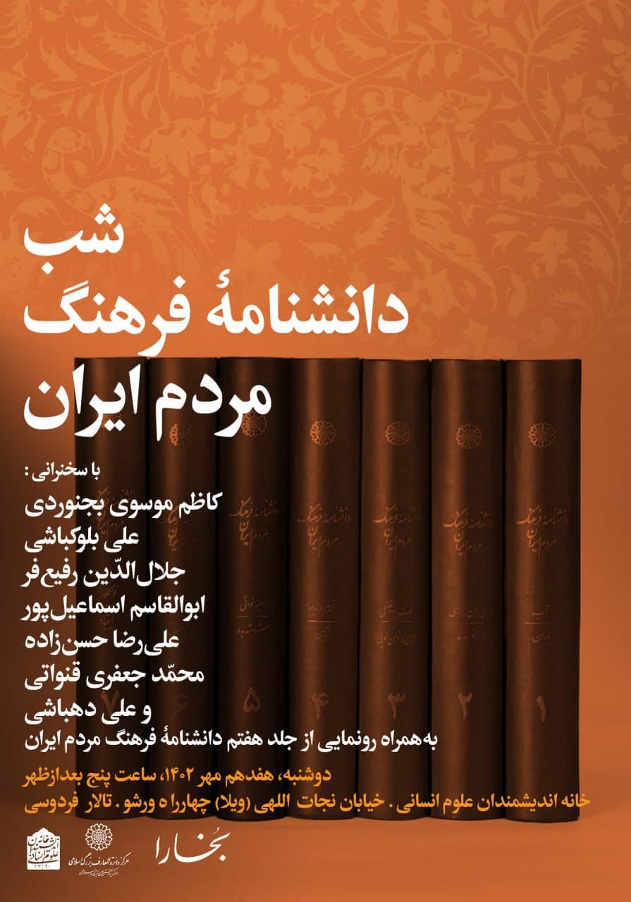 به گزارش روابط عمومی خانه اندیشمندان علوم انسانی، شب "دانشنامه فرهنگ مردم ایران" به همت مجله بخارا و مرکز دایرة المعارف بزرگ اسلامی و با همکاری خانه اندیشمندان علوم انسانی، روز دوشنبه ۱۷ مهر ۱۴۰۲ ساعت ۱۷ در سالن فردوسی خانه اندیشمندان علوم انسانی برگزار می شود.
