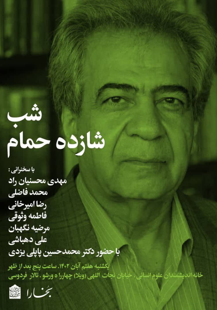 به گزارش روابط عمومی خانه اندیشمندان علوم انسانی، شب "شازده حمام" به همت مجله بخارا و با همکاری خانه اندیشمندان علوم انسانی، روز یکشنبه ۷ آبان ۱۴۰۲ ساعت ۱۷ در سالن فردوسی خانه اندیشمندان علوم انسانی برگزار می شود.