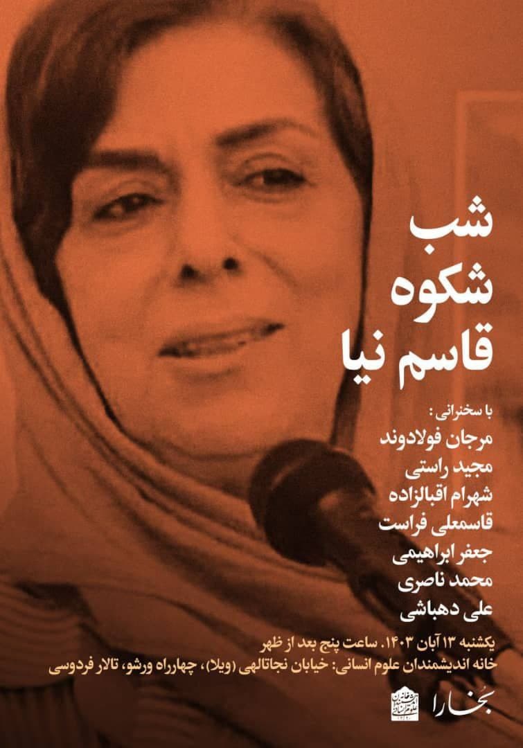 به گزارش روابط عمومی خانه اندیشمندان علوم انسانی، شب "شکوه قاسم نیا" به همت مجله بخارا و با همکاری خانه اندیشمندان علوم انسانی، روز یکشنبه 13 آبان 1403 ساعت 17 در سالن فردوسی خانه اندیشمندان علوم انسانی برگزار می شود.