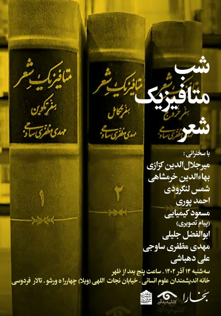 به گزارش روابط عمومی خانه اندیشمندان علوم انسانی، شب "متافیزیک شعر" به همت مجله بخارا و با همکاری خانه اندیشمندان علوم انسانی، روز سه شنبه ۱۴ آذر ۱۴۰۲ ساعت ۱۷ در سالن فردوسی خانه اندیشمندان علوم انسانی برگزار می شود.
