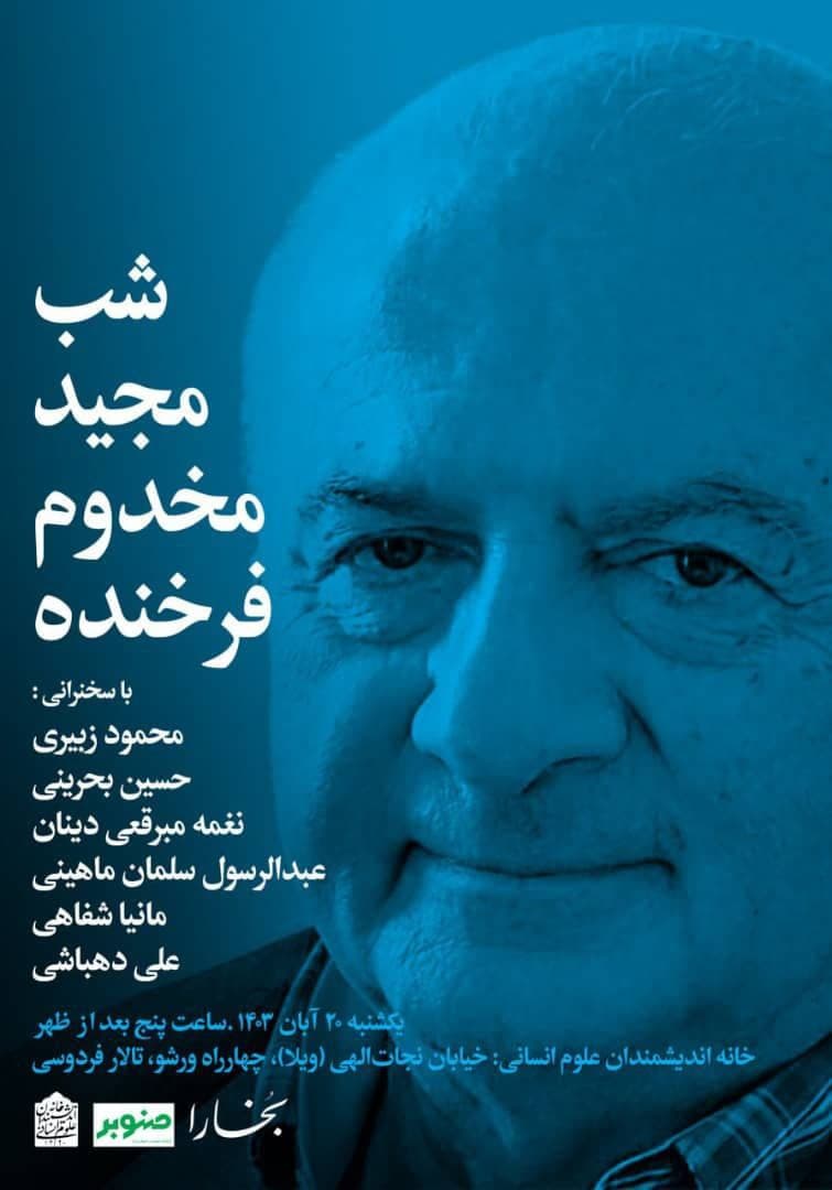 شب مجید مخدوم فرخنده، روز یکشنبه 20 آبان در سالن فردوسی خانه اندیشمندان علوم انسانی برگزار می شود.