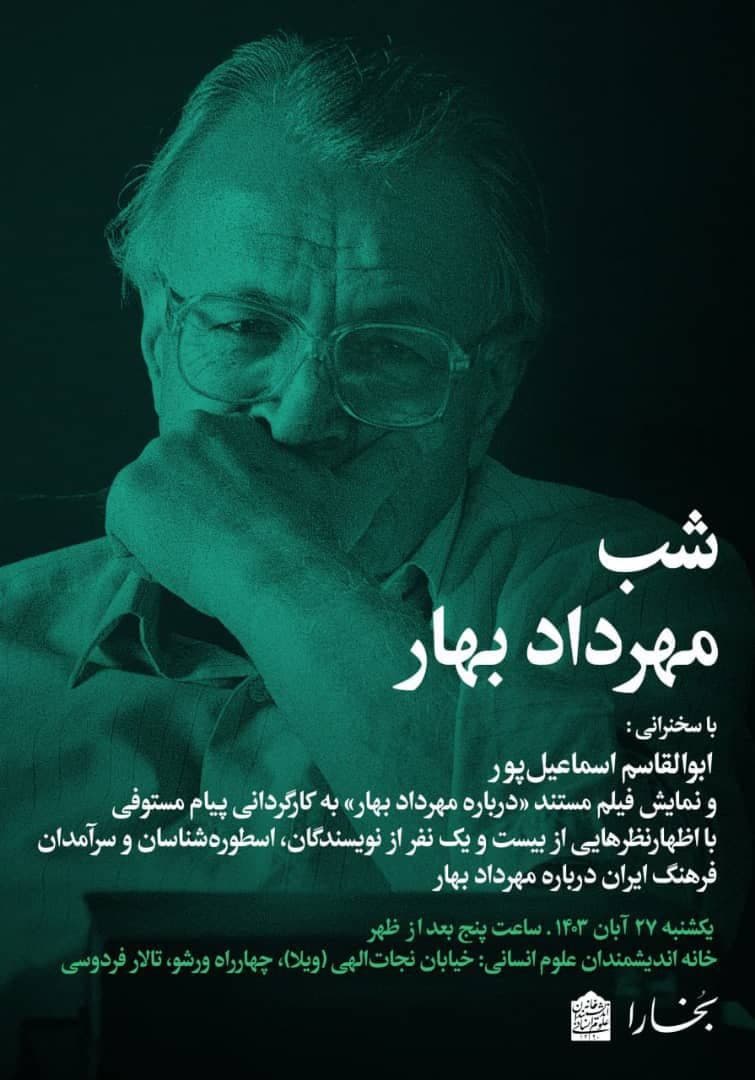 شب مهرداد بهار، روز یکشنبه 27 آبان در سالن فردوسی خانه اندیشمندان علوم انسانی برگزار می شود.