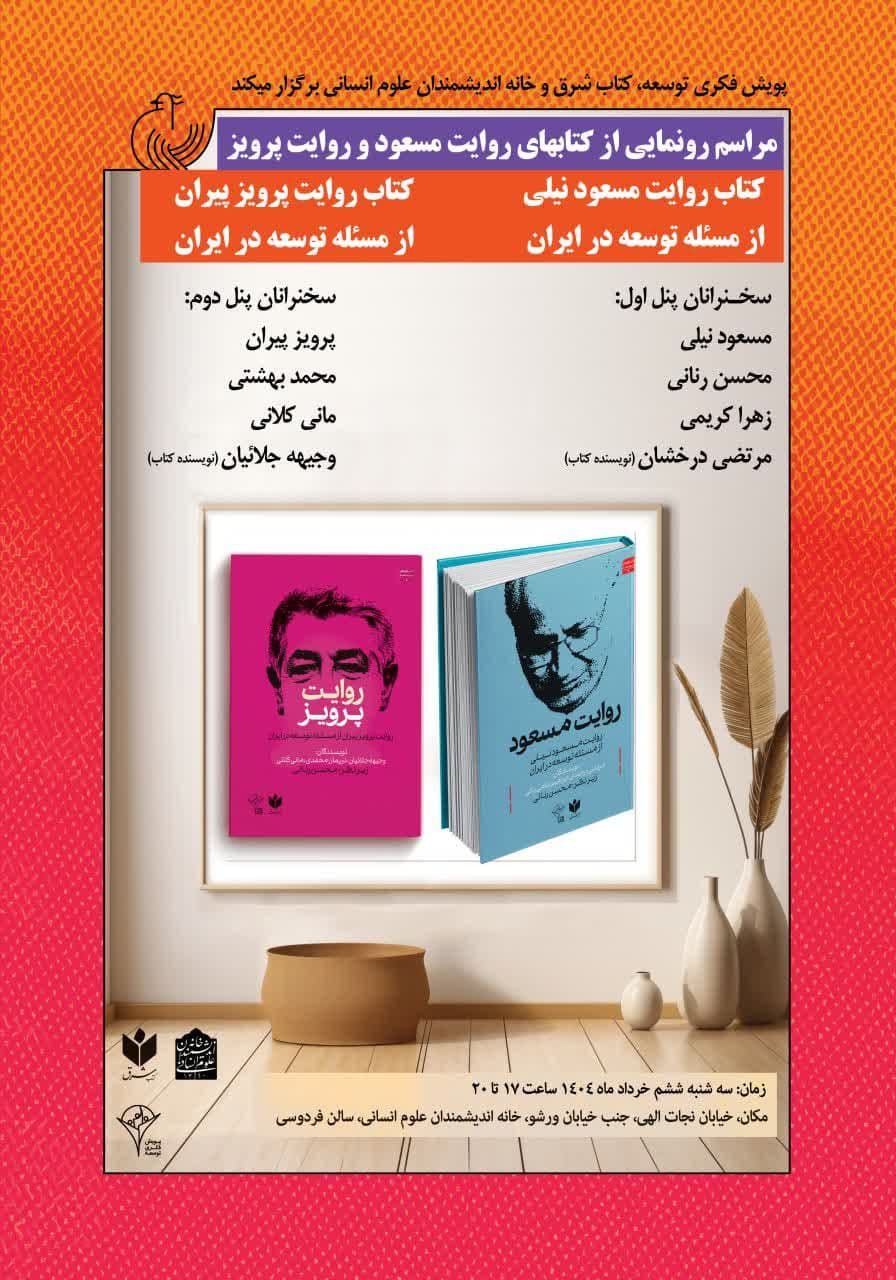 به گزارش روابط عمومی خانه اندیشمندان علوم انسانی، مراسم "رونمایی از کتابهای روایت مسعود و روایت پرویز" به همت پویش فکری توسعه، کتاب شرق و خانه اندیشمندان علوم انسانی، روز سه شنبه 6 خرداد 1404 ساعت 17 در سالن فردوسی خانه اندیشمندان علوم انسانی برگزار می شود.