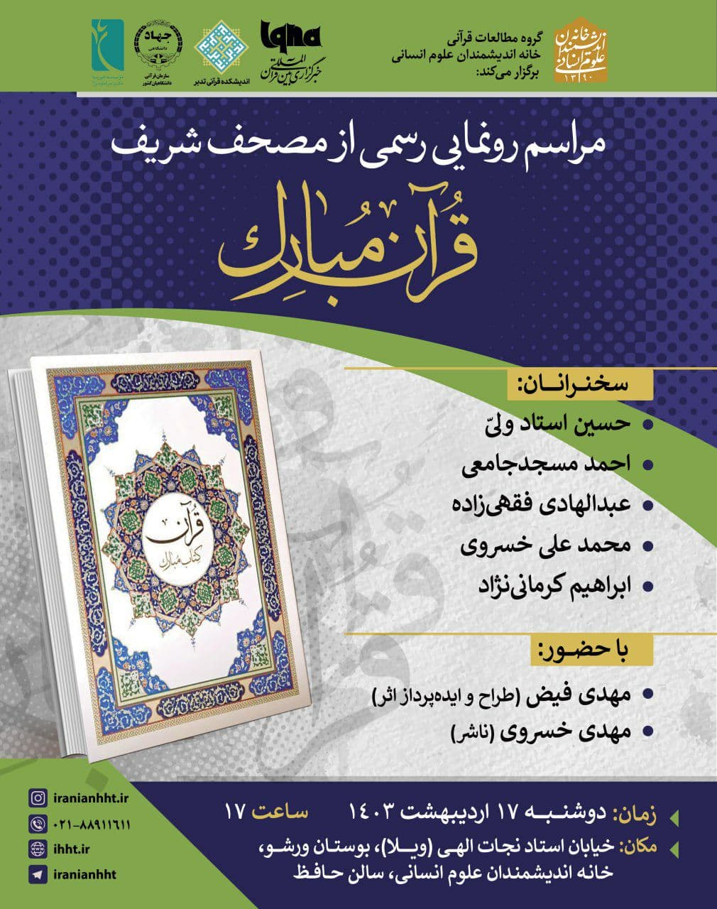 مراسم رونمایی رسمی از مصحف شریف قرآن مبارک، روز دوشنبه ۱۷ اردیبهشت در سالن حافظ خانه اندیشمندان علوم انسانی برگزار می شود.