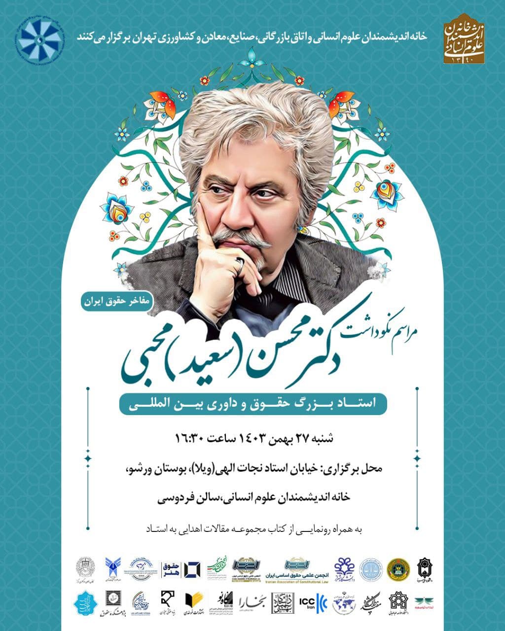 به گزارش روابط عمومی خانه اندیشمندان علوم انسانی، مراسم نکوداشت "دکتر محسن(سعید) محبی" به همت خانه اندیشمندان علوم انسانی و اتاق بازرگانی، صنایع، معادن و کشاورزی، روز شنبه 27 بهمن 1403 ساعت 16:30 در سالن فردوسی خانه اندیشمندان علوم انسانی برگزار می شود.