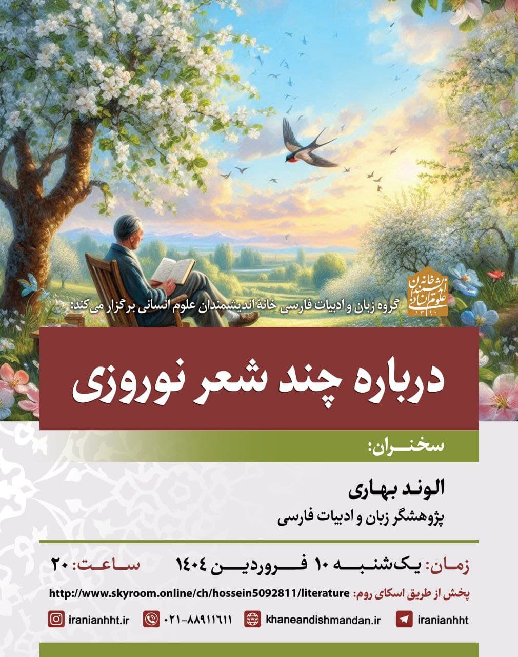به گزارش روابط عمومی خانه اندیشمندان علوم انسانی، نشست «درباره چند شعر نوروزی» به همت گروه زبان و ادبیات فارسی خانه اندیشمندان علوم انسانی، روز یکشنبه ۱۰ فروردین ۱۴۰۴ ساعت ۲۰ در بستر اسکای روم برگزار می شود.