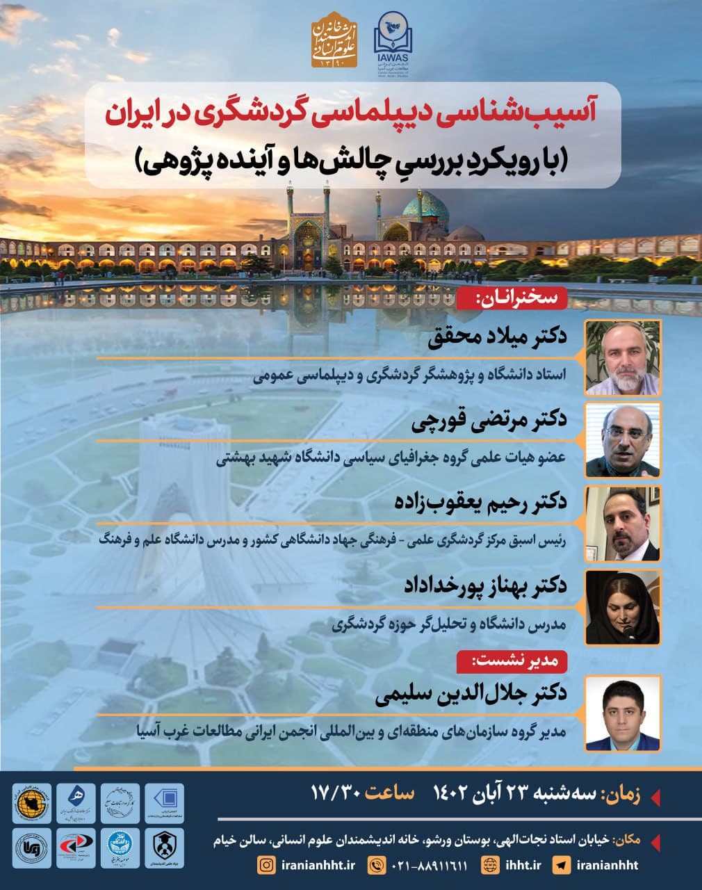 به گزارش روابط عمومی خانه اندیشمندان علوم انسانی، نشست "آسیب شناسی دیپلماسی گردشگری در ایران" به همت انجمن ایرانی مطالعات غرب آسیا و با همکاری خانه اندیشمندان علوم انسانی، روز سه شنبه ۲۳ آبان ۱۴۰۲ ساعت ۱۷:۳۰ در سالن خیام خانه اندیشمندان علوم انسانی برگزار می شود.