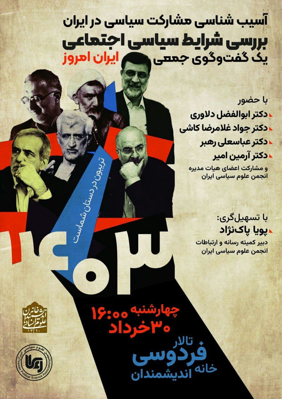 نشست "آسیب شناسی مشارکت سیاسی در ایران" روز چهارشنبه 30 خرداد در سالن فردوسی خانه اندیشمندان علوم انسانی برگزار می شود.