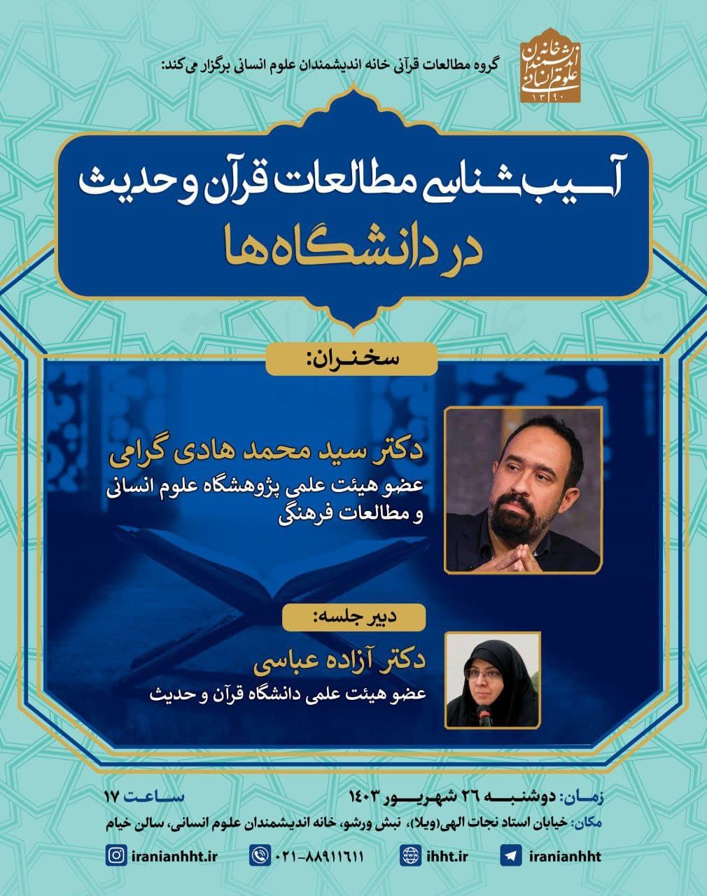 نشست "آسیب شناسی مطالعات قرآن و حدیث در دانشگاه ها" روز دوشنبه 26 شهریور در سالن خیام خانه اندیشمندان علوم انسانی برگزار می شود.