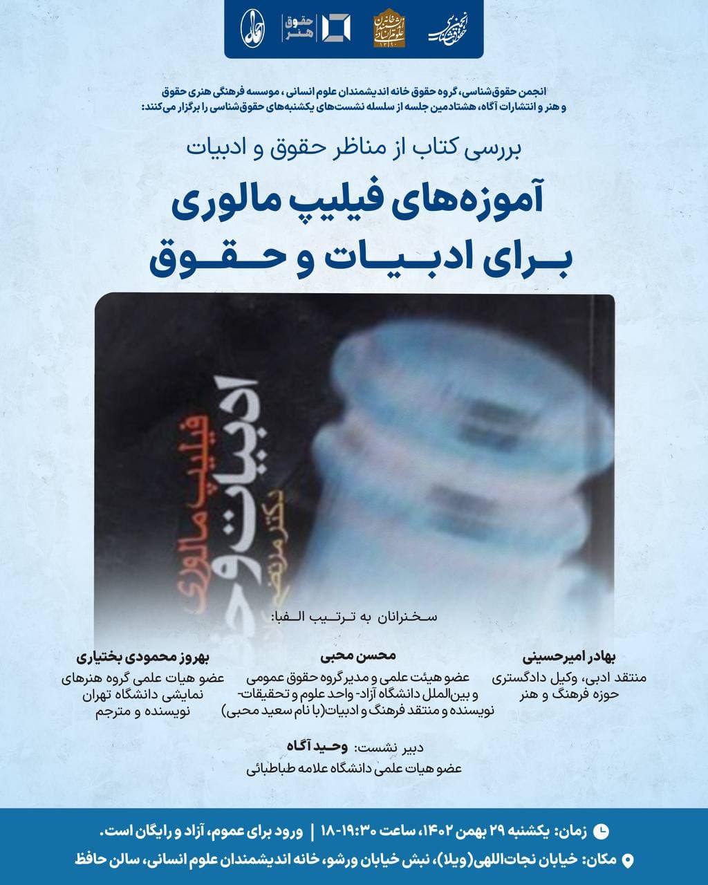 نشست "آموزه های فیلیپ مالوری برای ادبیات و حقوق" روز یکشنبه ۲۹ بهمن در سالن حافظ خانه اندیشمندان علوم انسانی برگزار می شود.