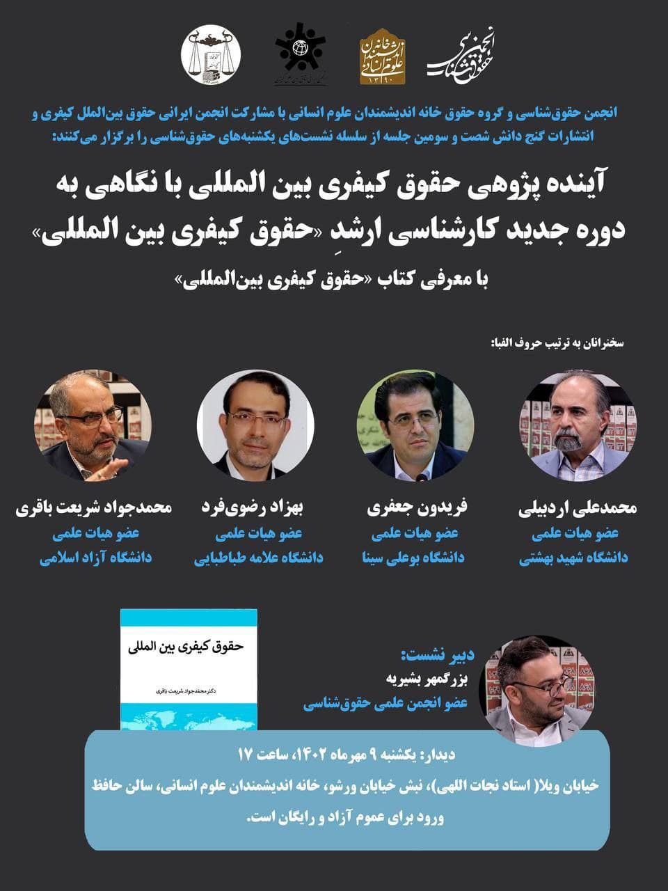 نشست "آینده پژوهی حقوق کیفری بین المللی" روز یکشنبه ۹ مهر در سالن حافظ خانه اندیشمندان علوم انسانی برگزار می شود.