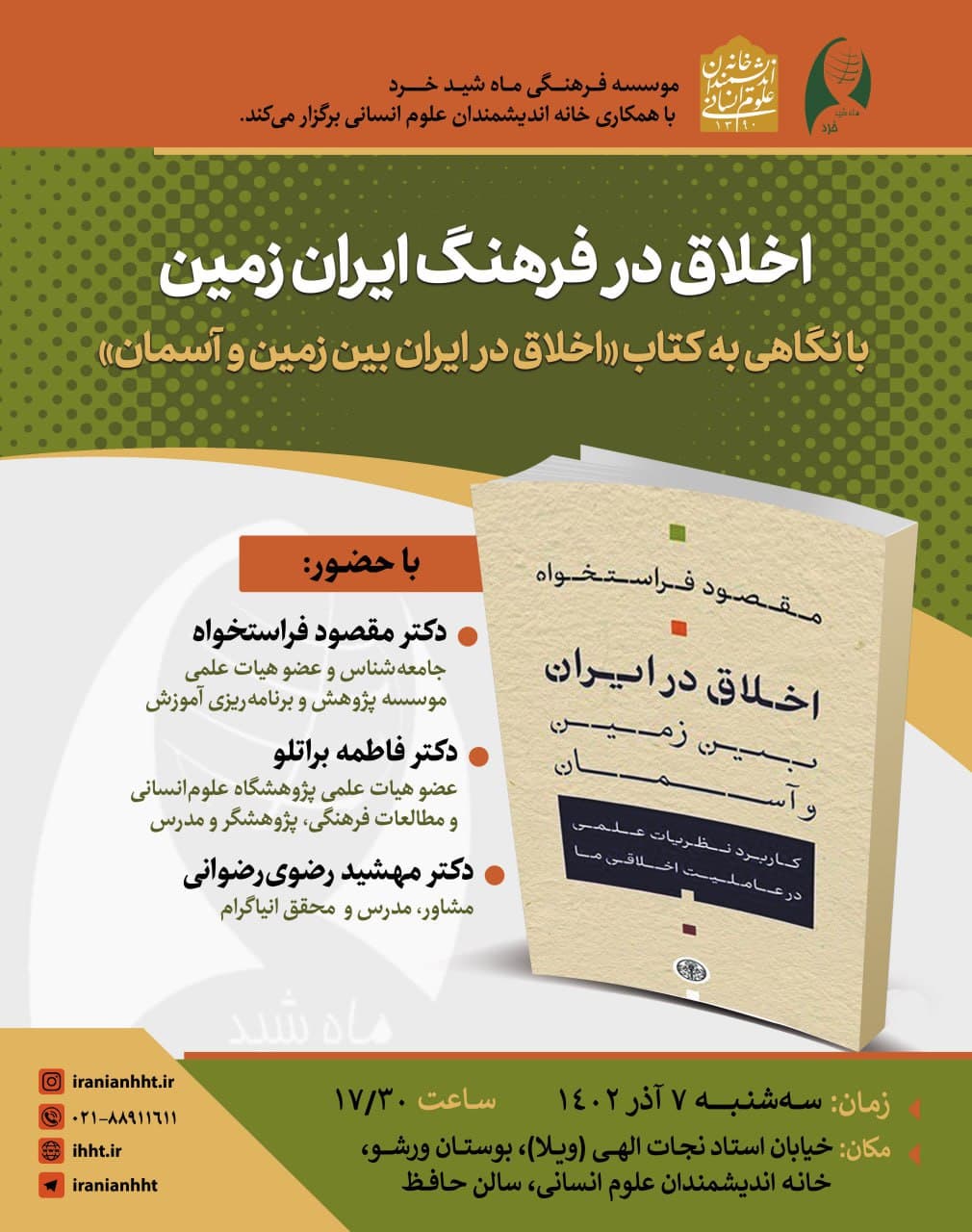 به گزارش روابط عمومی خانه اندیشمندان علوم انسانی، نشست "اخلاق در فرهنگ ایران زمین" به همت موسسه فرهنگی ماه شید خرد و با همکاری خانه اندیشمندان علوم انسانی، روز سه شنبه ۷ آذر ۱۴۰۲ ساعت ۱۷:۳۰ در سالن حافظ خانه اندیشمندان علوم انسانی برگزار می شود.