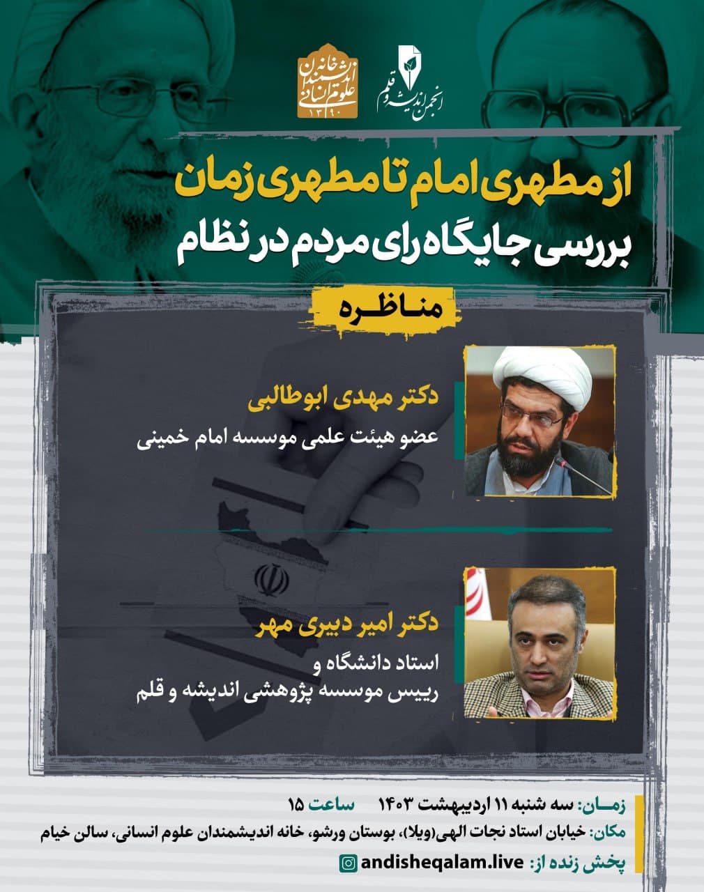 به گزارش روابط عمومی خانه اندیشمندان علوم انسانی، نشست "از مطهری امام تا مطهری زمان" به همت انجمن اندیشه و قلم و با همکاری خانه اندیشمندان علوم انسانی، روز سه شنبه ۱۱ اردیبهشت ۱۴۰۳ ساعت ۱۵ در سالن خیام خانه اندیشمندان علوم انسانی برگزار می شود.
