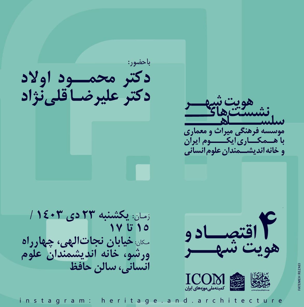 به گزارش روابط عمومی خانه اندیشمندان علوم انسانی، نشست "اقتصاد و هویت شهر" به همت موسسه فرهنگی میراث و معماری و با همکاری ایکوم ایران و خانه اندیشمندان علوم انسانی، روز یکشنبه 23 دی 1403 ساعت 15 در سالن حافظ خانه اندیشمندان علوم انسانی برگزار می شود.