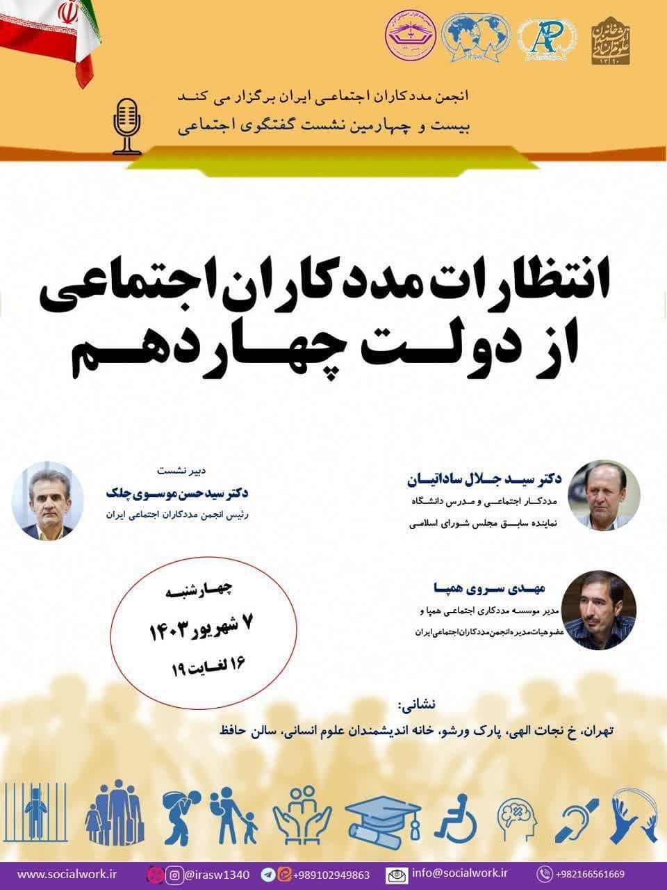 نشست "انتظارات مددکاران اجتماعی از دولت چهاردهم" روز چهارشنبه 7 شهریور در سالن حافظ خانه اندیشمندان علوم انسانی برگزار می شود.