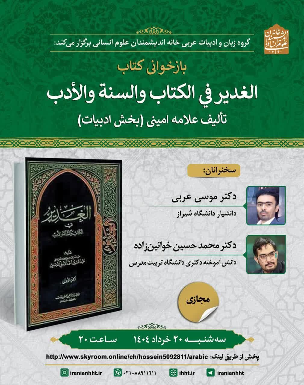به گزارش روابط عمومی خانه اندیشمندان علوم انسانی، نشست "بازخوانی کتاب الغدیر فی الکتاب والسنة و الادب" به همت گروه زبان و ادبیات عربی خانه اندیشمندان علوم انسانی، روز سه شنبه 20 خرداد 1404 ساعت 20 در بستر اسکای روم برگزار می شود.