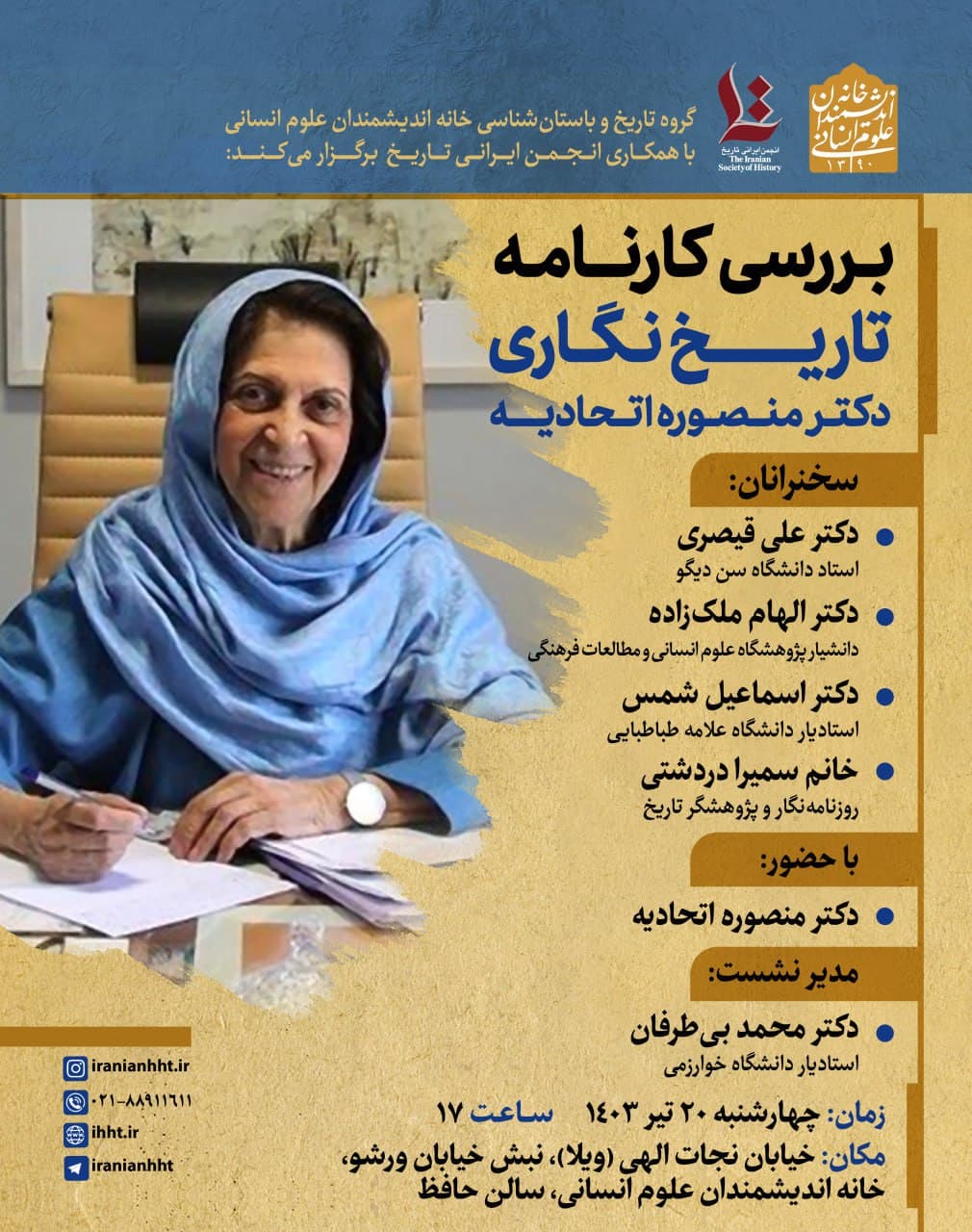 به گزارش روابط عمومی خانه اندیشمندان علوم انسانی، نشست "بررسی کارنامه تاریخ نگاری دکتر منصوره اتحادیه" به همت گروه تاریخ و باستان شناسی خانه اندیشمندان علوم انسانی با همکاری انجمن ایرانی تاریخ، روز چهارشنبه 20 تیر 1403 ساعت 17 در سالن حافظ خانه اندیشمندان علوم انسانی برگزار می شود.