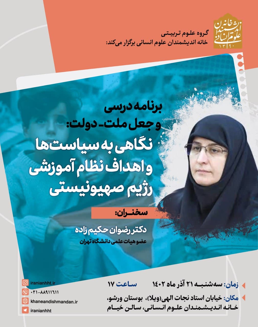 به گزارش روابط عمومی خانه اندیشمندان علوم انسانی، نشست "برنامه درسی و جعل ملت - دولت" به همت گروه علوم تربیتی خانه اندیشمندان علوم انسانی، روز سه شنبه ۲۱ آذر ۱۴۰۲ ساعت ۱۷ با حضور رضوان حکیم زاده در سالن خیام خانه اندیشمندان علوم انسانی برگزار می شود.