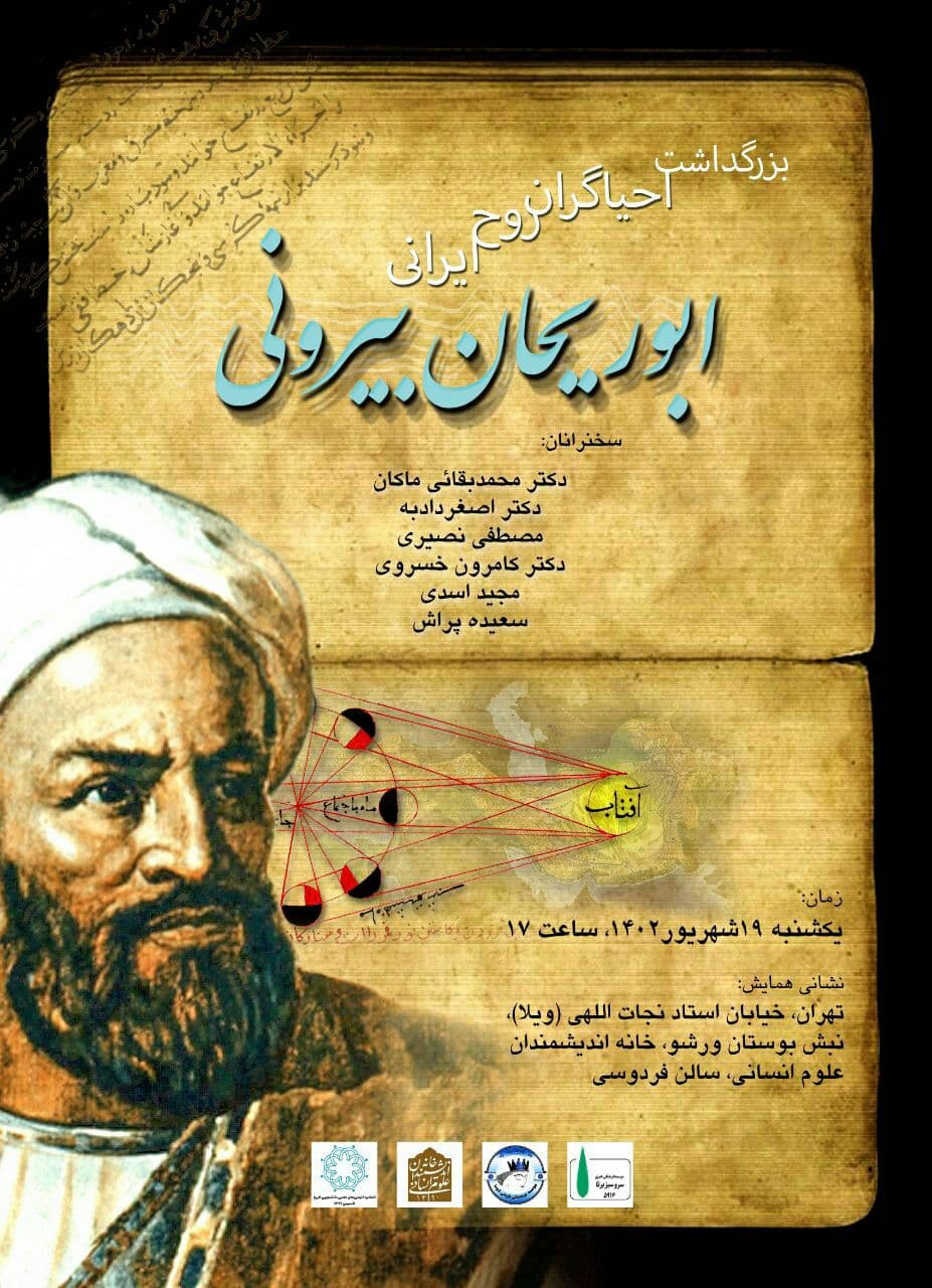 به گزارش روابط عمومی خانه اندیشمندان علوم انسانی، نشست بزرگداشت ابوریحان بیرونی به همت موسسه فرهنگی هنری سرو سبز و با همکاری خانه اندیشمندان علوم انسانی، روز یکشنبه ۱۹ شهریور ۱۴۰۲ ساعت ۱۷ در سالن فردوسی خانه اندیشمندان علوم انسانی برگزار می شود.