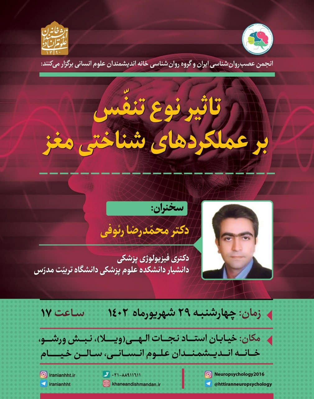 به گزارش روابط عمومی خانه اندیشمندان علوم انسانی، نشست "تاثیر نوع تنفس بر عملکردهای شناختی مغز" به همت انجمن عصب روان شناسی ایران و با همکاری گروه روان شناسی خانه اندیشمندان علوم انسانی، روز چهارشنبه ۲۹ شهریور ۱۴۰۲ ساعت ۱۷ با سخنرانی محمدرضا رئوفی در سالن حافظ خانه اندیشمندان علوم انسانی برگزار می شود.