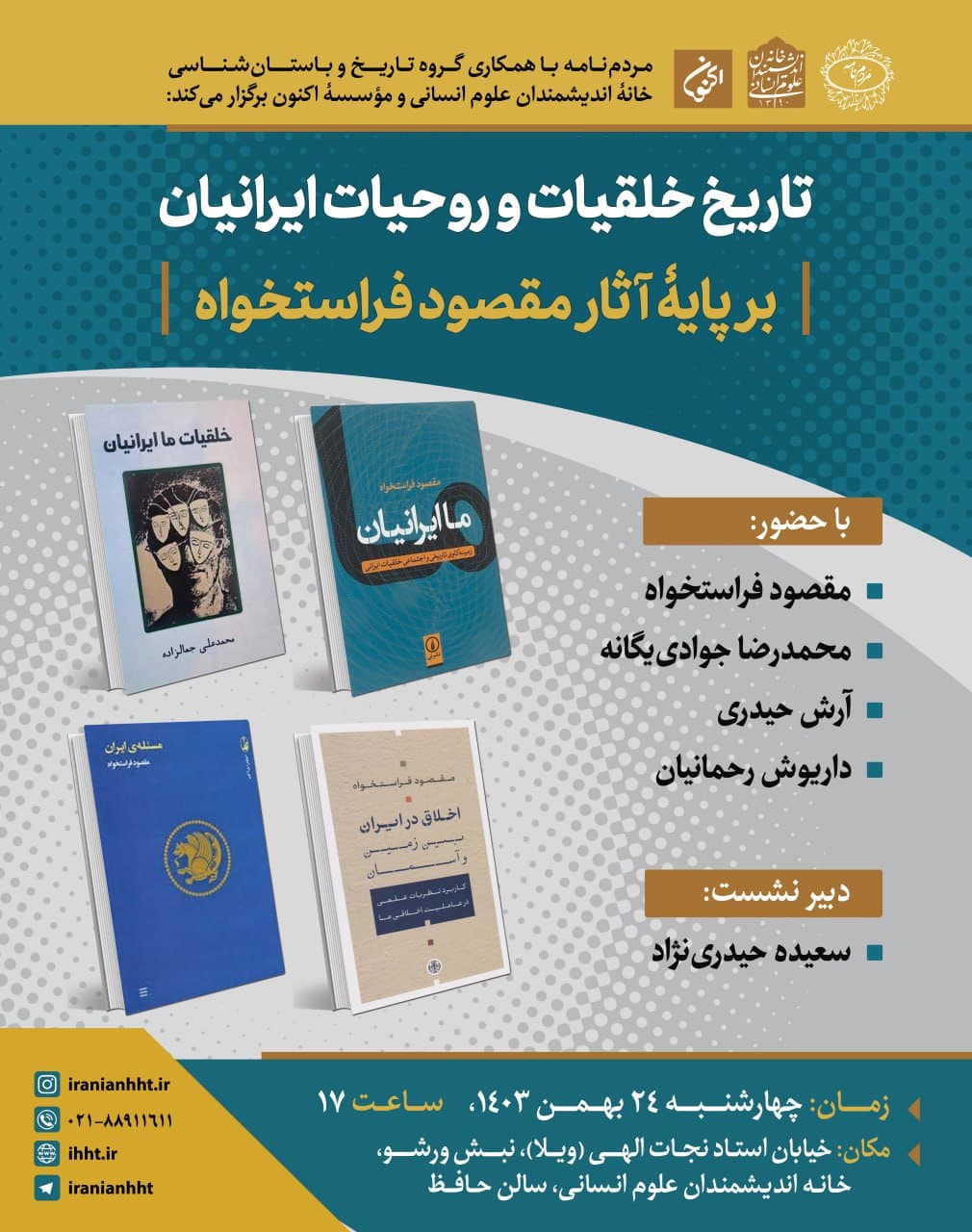 به گزارش روابط عمومی خانه اندیشمندان علوم انسانی، نشست "تاریخ خلقیات و روحیات ایرانیان بر پایه آثار مقصود فراستخواه" به همت مجله مردم نامه و با همکاری گروه تاریخ و باستان شناسی خانه اندیشمندان علوم انسانی، روز چهارشنبه 24 بهمن 1403 ساعت 17 در سالن حافظ خانه اندیشمندان علوم انسانی برگزار می شود.