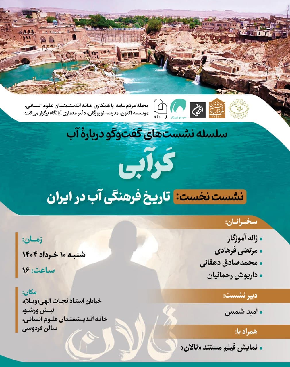 به گزارش روابط عمومی خانه اندیشمندان علوم انسانی، نشست "تاریخ فرهنگی آب در ایران" به همت مجله مردم نامه و با همکاری خانه اندیشمندان علوم انسانی، موسسه اکنون، مدرسه نوروزگان و دفتر معماری آبانگاه، روز شنبه 10 خرداد 1404 ساعت 16 در سالن فردوسی خانه اندیشمندان علوم انسانی برگزار می شود.