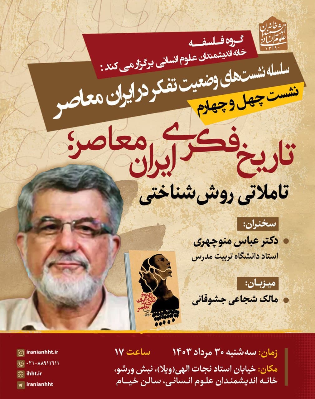 به گزارش روابط عمومی خانه اندیشمندان علوم انسانی، نشست "تاریخ فکری ایران معاصر؛ تاملاتی روش شناختی" به همت گروه فلسفه خانه اندیشمندان علوم انسانی، روز سه شنبه 30 مرداد 1403 ساعت 17 در سالن خیام خانه اندیشمندان علوم انسانی برگزار می شود.