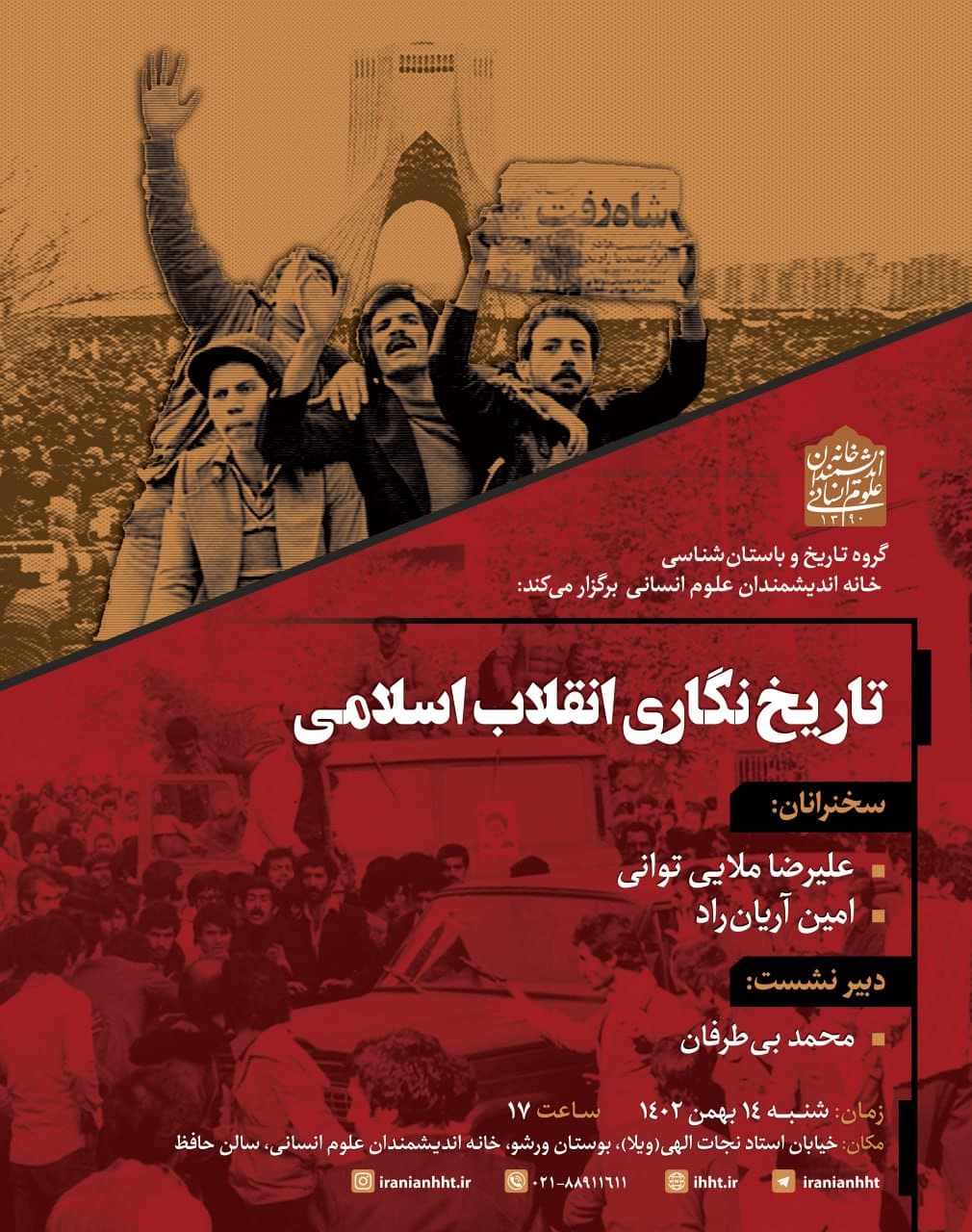نشست "تاریخ نگاری انقلاب اسلامی" روز شنبه ۱۴ بهمن در سالن حافظ خانه اندیشمندان علوم انسانی برگزار می شود.