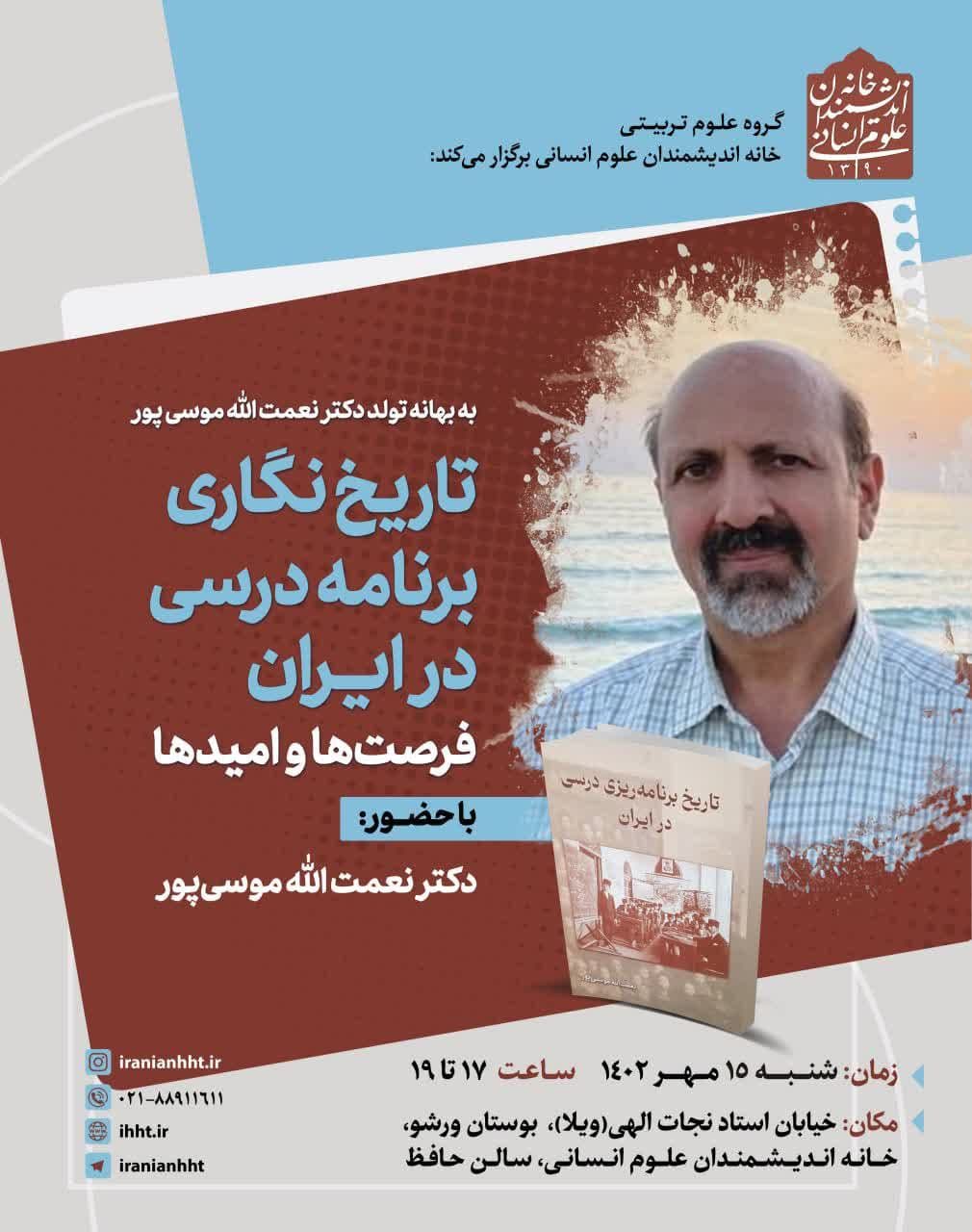 به گزارش روابط عمومی خانه اندیشمندان علوم انسانی، نشست "تاریخ نگاری برنامه درسی در ایران" به همت گروه علوم تربیتی خانه اندیشمندان علوم انسانی، روز شنبه ۱۵ مهر ۱۴۰۲ ساعت ۱۷ با سخنرانی نعمت الله موسی پور در سالن حافظ خانه اندیشمندان علوم انسانی برگزار می شود.