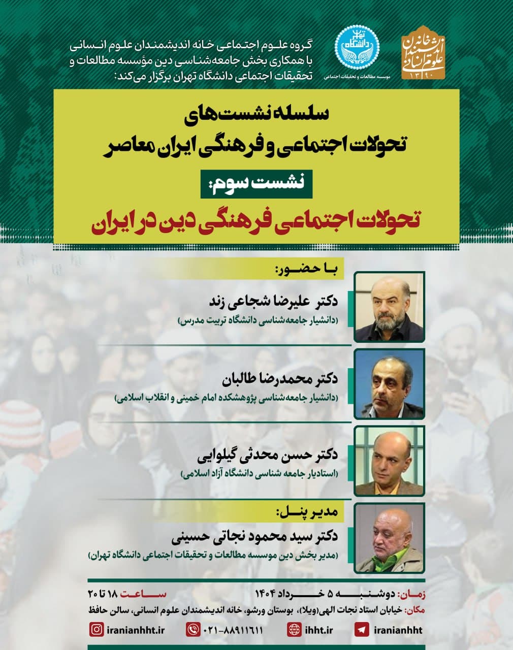 به گزارش روابط عمومی خانه اندیشمندان علوم انسانی، نشست "تحولات اجتماعی فرهنگی دین در ایران" به همت گروه علوم اجتماعی خانه اندیشمندان علوم انسانی و با همکاری بخش جامعه شناسی دین موسسه مطالعات و تحقیقات اجتماعی دانشگاه تهران، روز دوشنبه 5 خرداد 1404 ساعت 18 در سالن حافظ خانه اندیشمندان علوم انسانی برگزار می شود.