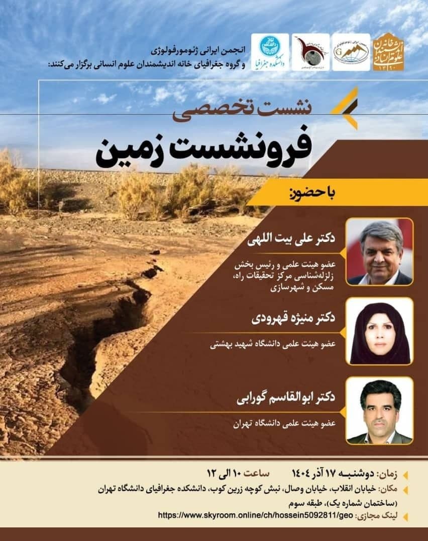 به گزارش روابط عمومی خانه اندیشمندان علوم انسانی، نشست تخصصی "فرونشست زمین" به همت انجمن ایرانی ژئومورفولوژی و گروه جغرافیای خانه اندیشمندان علوم انسانی، روز دوشنبه 17 آذر 1404 ساعت 10 در دانشکده جغرافیای دانشگاه تهران برگزار می شود.