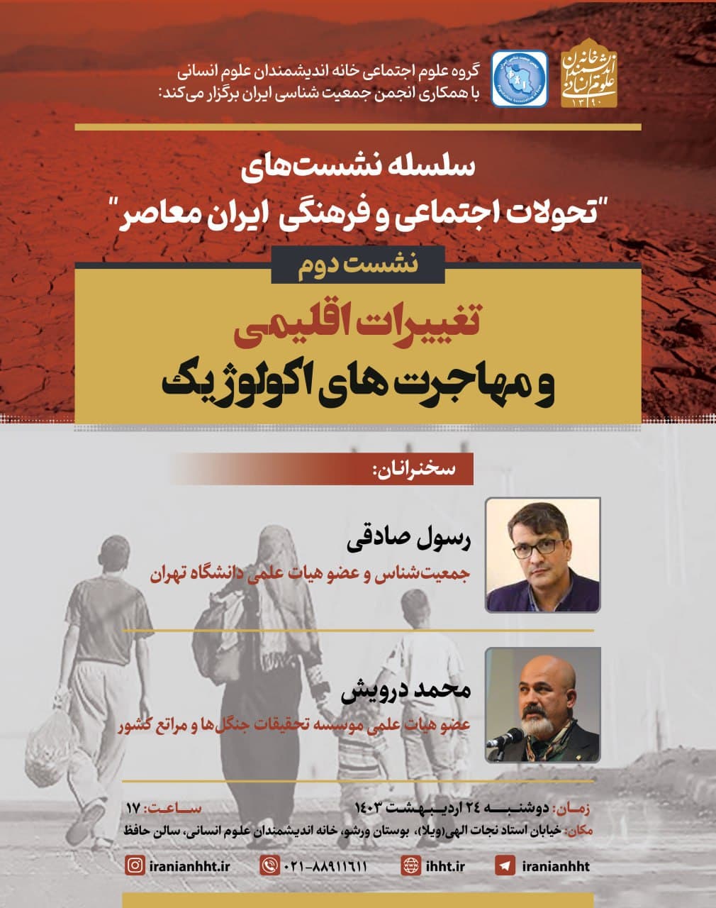 نشست "تغییرات اقلیمی و مهاجرت های اکولوژیک" روز دوشنبه 24 اردیبهشت در سالن حافظ خانه اندیشمندان علوم انسانی برگزار می شود.