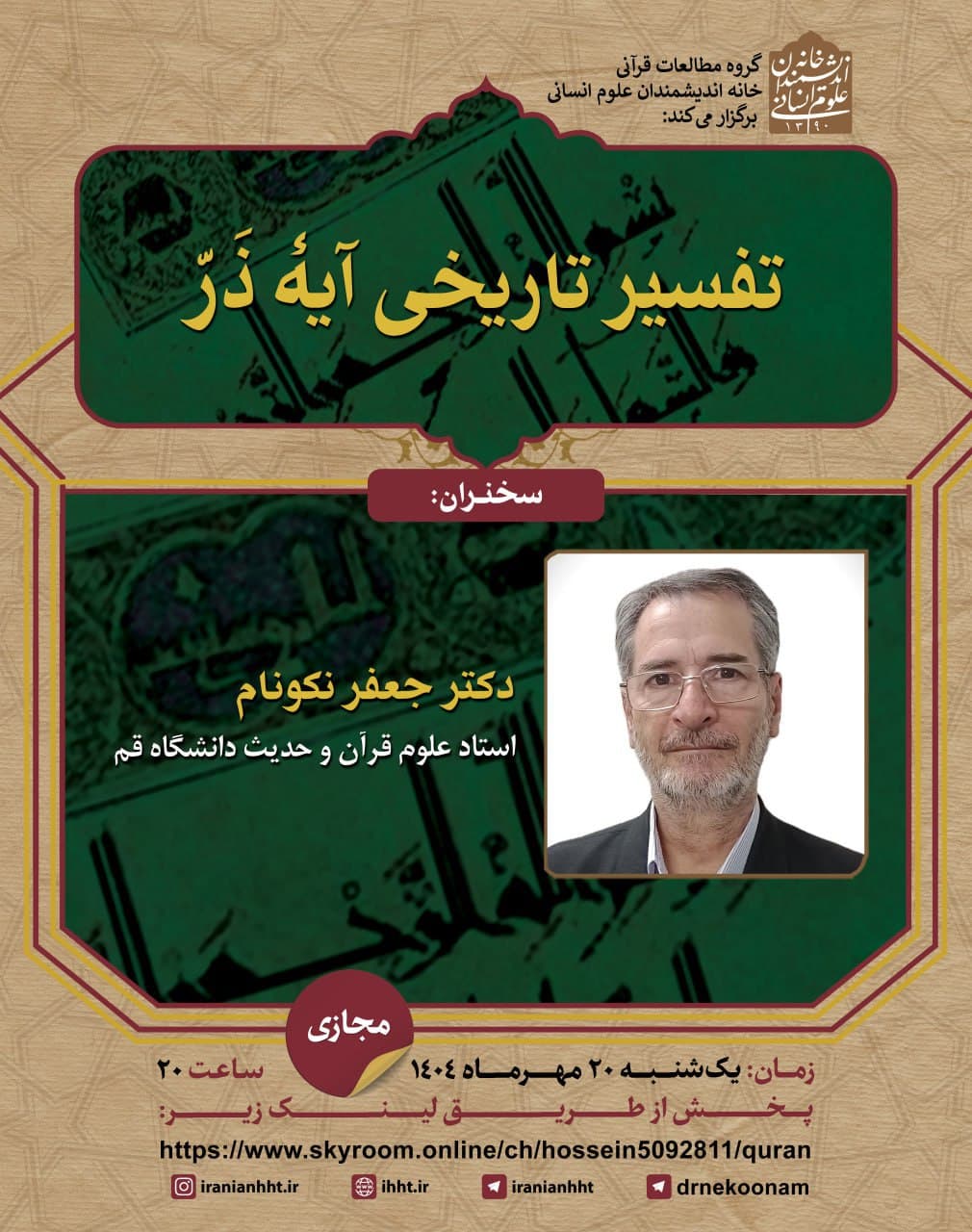به گزارش روابط عمومی خانه اندیشمندان علوم انسانی، نشست "تفسیر تاریخی آیه ذرّ" به همت گروه مطالعات علوم قرآنی خانه اندیشمندان علوم انسانی، روز یکشنبه 20 مهر 1404 ساعت 20 در بستر اسکای روم برگزار می شود.