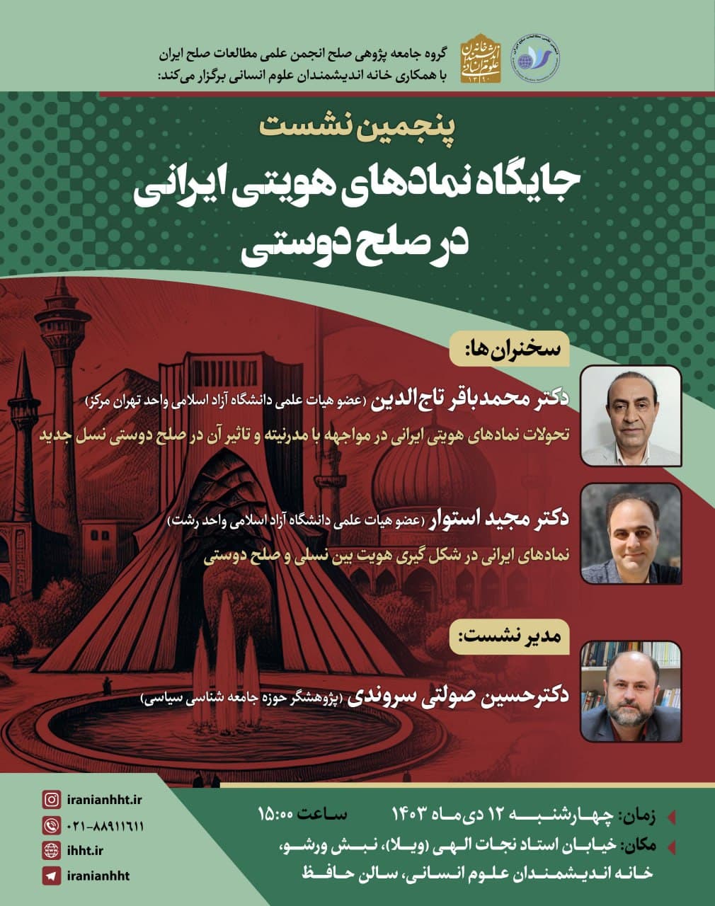 نشست "جایگاه نمادهای هویتی ایرانی در صلح دوستی" روز چهارشنبه 12 دی در سالن حافظ خانه اندیشمندان علوم انسانی برگزار می شود.
