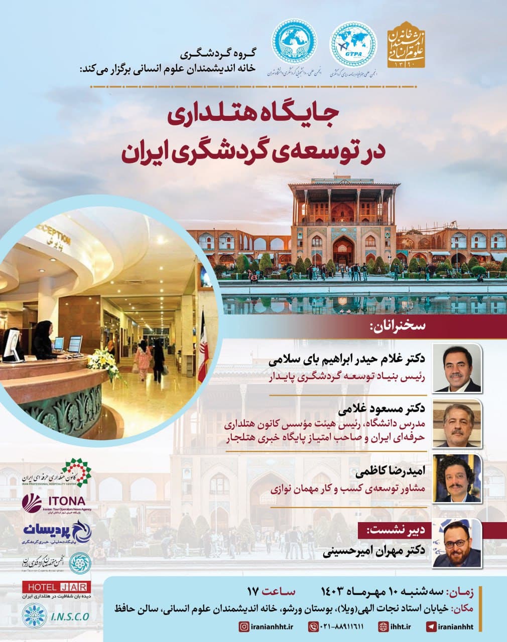 نشست "جایگاه هتلداری در توسعه ی گردشگری ایران" روز سه شنبه 10 مهر در سالن حافظ خانه اندیشمندان علوم انسانی برگزار می شود.