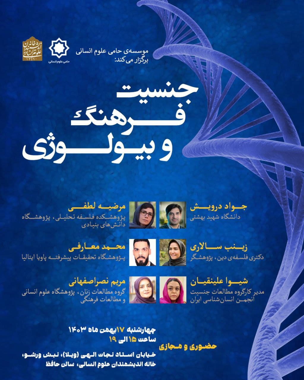نشست "جنسیت، فرهنگ و بیولوژی" روز چهارشنبه 17 بهمن در سالن حافظ خانه اندیشمندان علوم انسانی برگزار می شود.