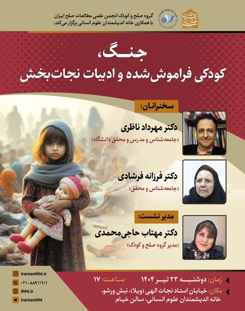 به گزارش روابط عمومی خانه اندیشمندان علوم انسانی، نشست "جنگ، کودکی فراموش شده و ادبیات نجات بخش" به همت انجمن مطالعات صلح ایران و با همکاری خانه اندیشمندان علوم انسانی، روز دوشنبه 23 تیر 1404 ساعت 17 در سالن خیام خانه اندیشمندان علوم انسانی برگزار می شود.