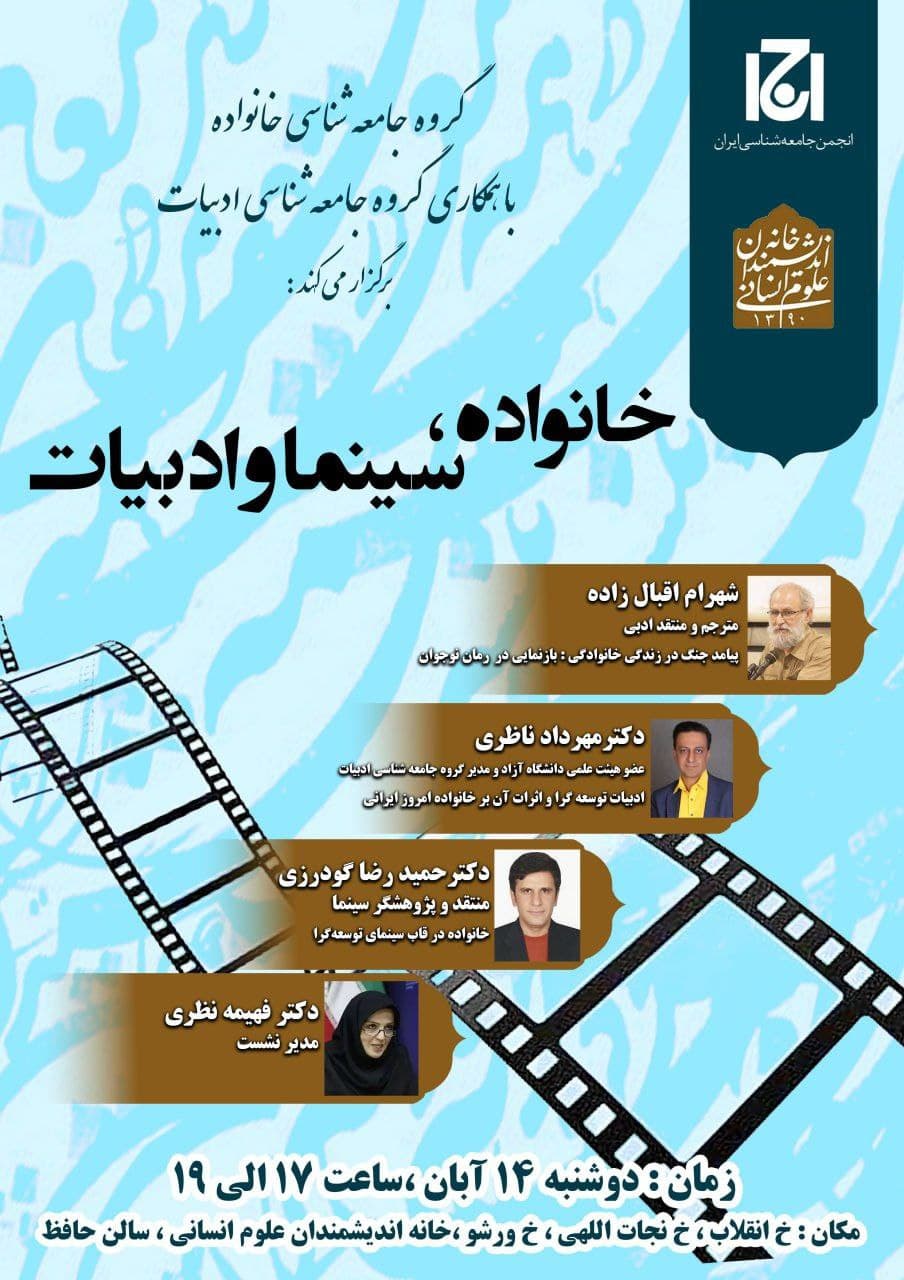 نشست "خانواده، سینما و ادبیات" روز دوشنبه 14 آبان در سالن حافظ خانه اندیشمندان علوم انسانی برگزار می شود.