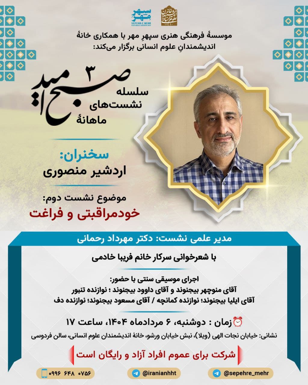 به گزارش روابط عمومی خانه اندیشمندان علوم انسانی، نشست "خودمراقبتی و فراغت" به همت موسسه فرهنگی هنری سپهر مهر و با همکاری خانه اندیشمندان علوم انسانی، روز دوشنبه 6 مرداد 1404 ساعت 17 در سالن فردوسی خانه اندیشمندان علوم انسانی برگزار می شود.